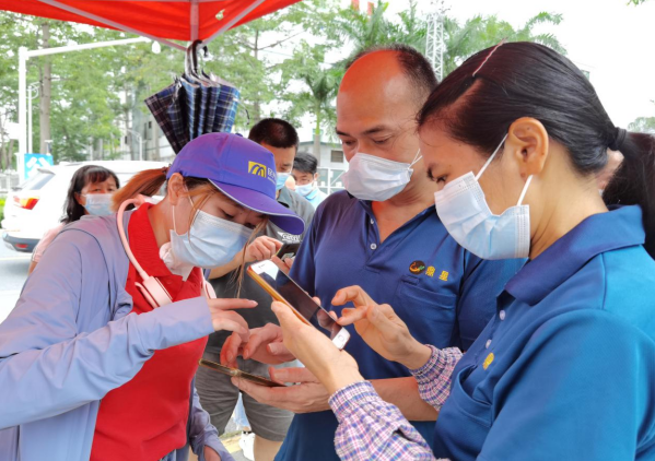 “谢谢,多亏了你们帮忙,要不然真不知如何是好!”6月8日晚9点,在位于宏盈工业区停车场处的新冠病毒核酸筛查采集点,65岁的黄大伯完成核酸采样后连忙跑到入口信息登记处向志愿者阿川鞠躬道谢。原来,黄大伯当晚只身前来核检,使用的是老人机,又不懂操作,志愿者阿川了解了老人的不便后,主动掏出自己的手机帮助老人扫码登记,耐心讲解核酸检测流程,一步步引导,直到核酸采样完成。“这种情况还蛮多的,我们希望能够通过自己的力量帮助到他人,传递社会温暖,也算是为抗击疫情贡献一份微薄之力。”